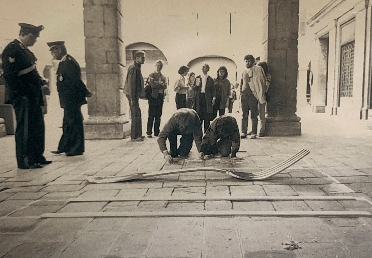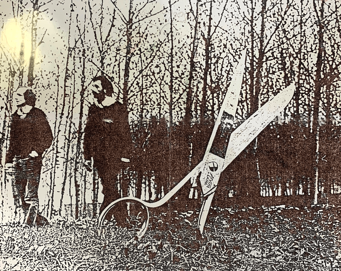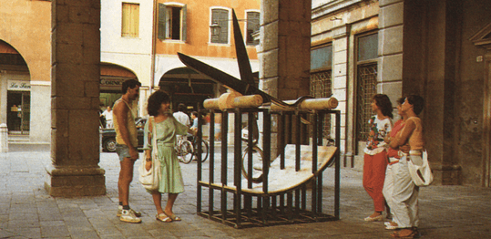 Una mostra fatta per nessuno: una grande forbice in acciaio inox piantata lungo un argine-bosco del fiume Adige nel 1983. “Tagliare col passato” suonava il titolo: l’erba era fresca, l’acqua scorreva, la forbice pesava oltre due quintali. Io e Sandro a far fatica.
