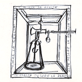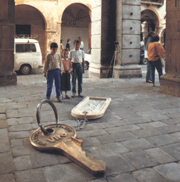 Tutti vivono una fase di cose grandi, più grandi, ma vere, per dire la verità del titolo o del sogno. Da un portico-slargo antico, lungo la via della città murata, si accedeva al municipio: lì si collocavano i “Bisogni astratti”. Una grande forchetta in acciaio inox era stata posata in un riquadro geometrico segnato dal colore attorniata dalle parole del titolo.