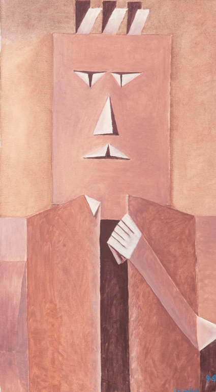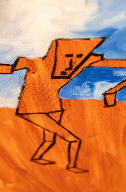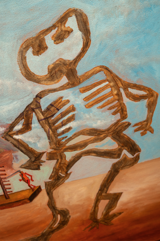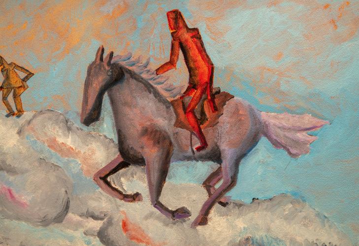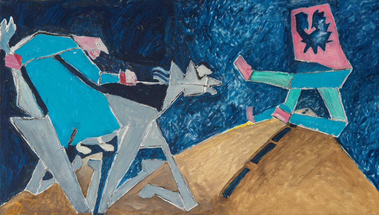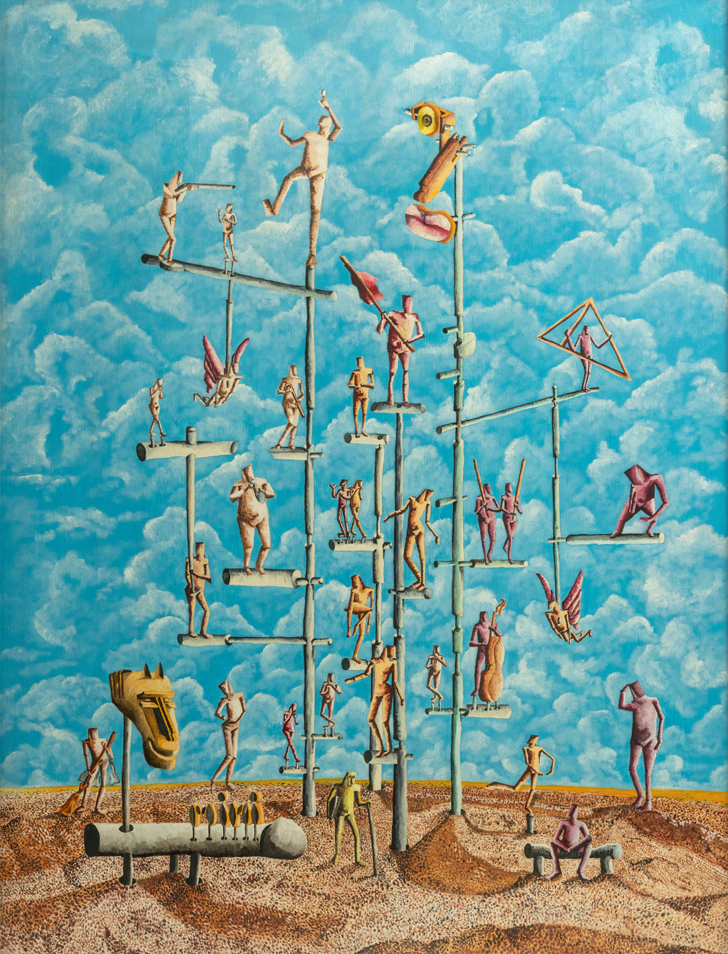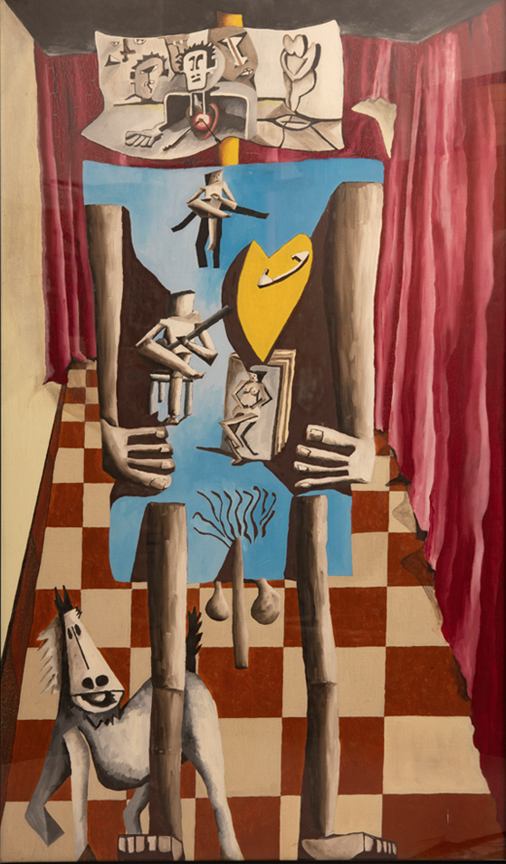 Personaggi senza corpo reale, con le figure che sono carte piegate, qualche riferimento a Mantegna, a viaggi con barchette a vela, a scheletroni, cavalli in cielo – un assemblaggio di cose varie. Una mano. Un uomo con cane in miniappartamento – Visi un po’ originali. Piatti che viviono appena Togli forme geometriche e le alzi – Di questo si potevano fare generazioni di quadri…… Ma si poteva anche togliere… Marron dalle carta – Sembra quasi una miniera