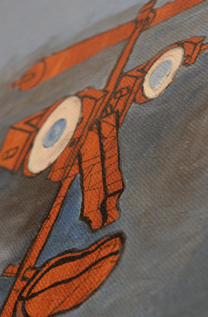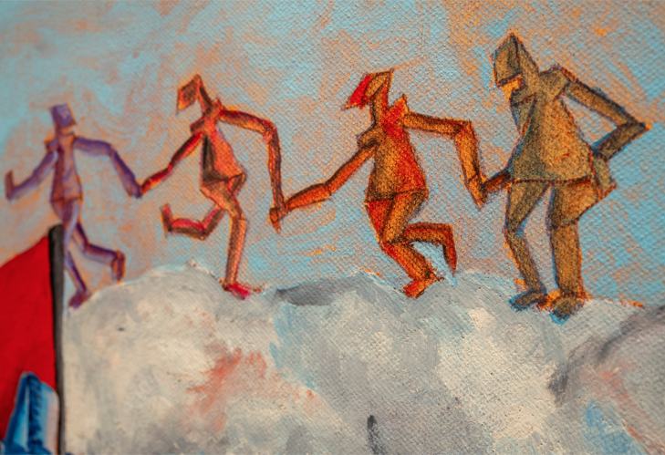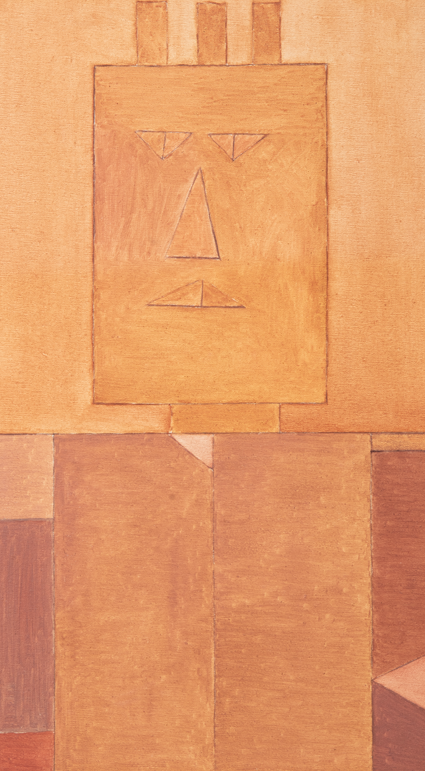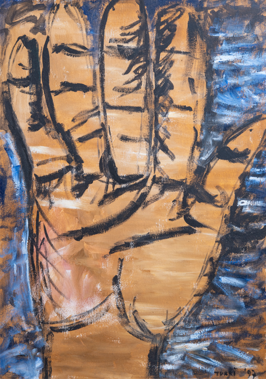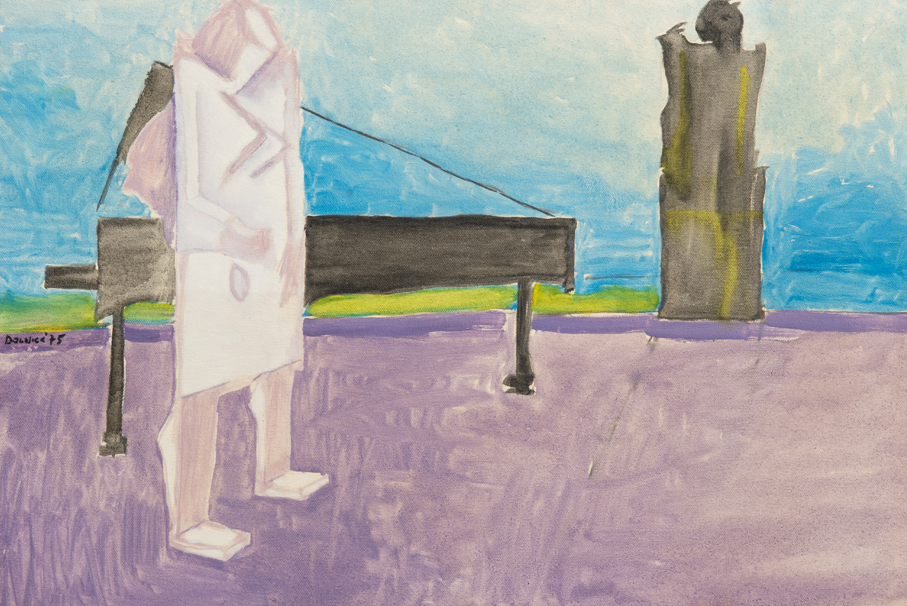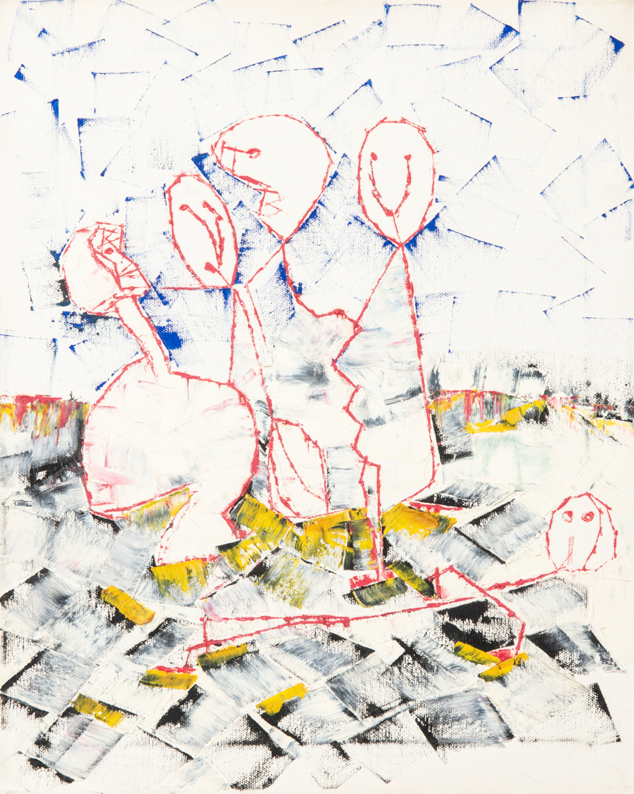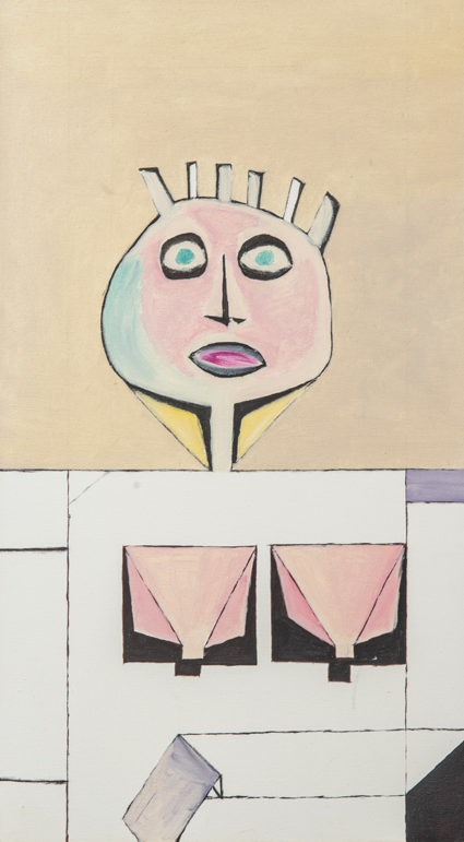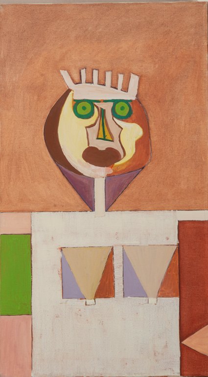Personaggi senza corpo reale, con le figure che sono carte piegate, qualche riferimento a Mantegna, a viaggi con barchette a vela, a scheletroni, cavalli in cielo – un assemblaggio di cose varie. Una mano. Un uomo con cane in miniappartamento – Visi un po’ originali. Piatti che viviono appena Togli forme geometriche e le alzi – Di questo si potevano fare generazioni di quadri…… Ma si poteva anche togliere… Marron dalle carta – Sembra quasi una miniera