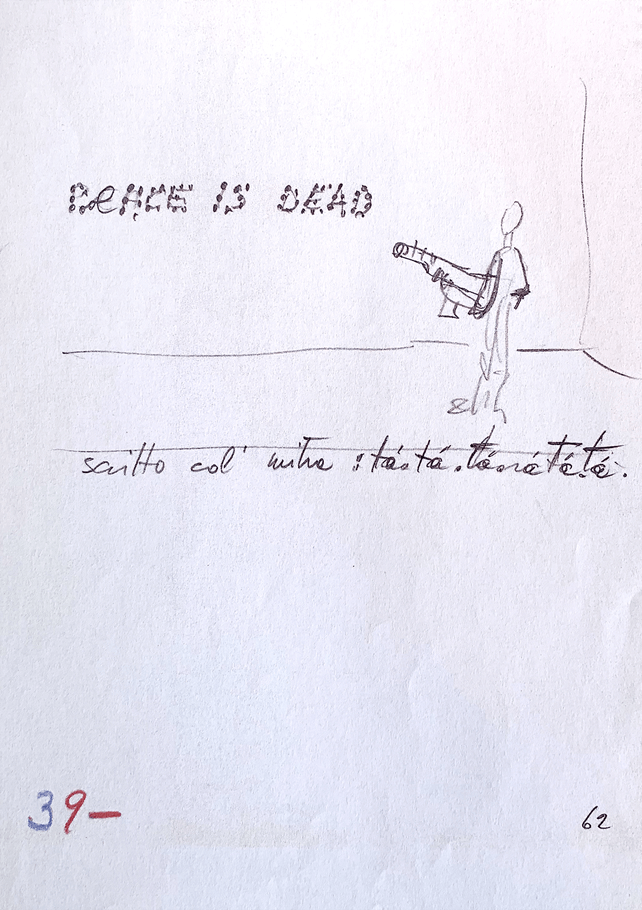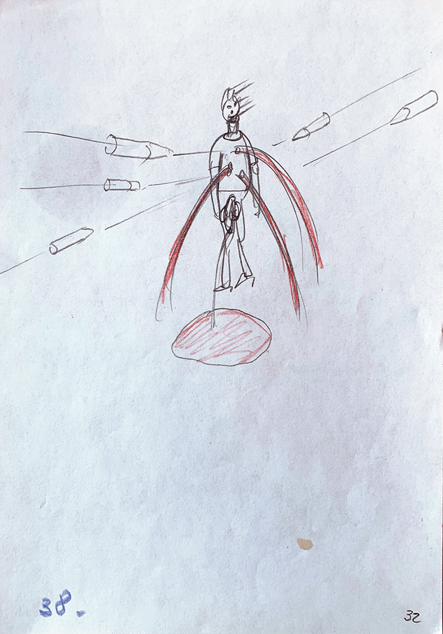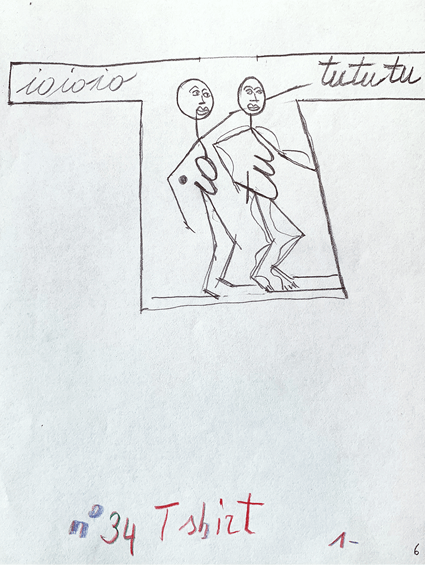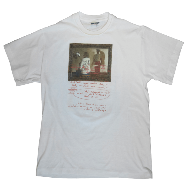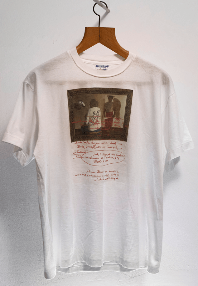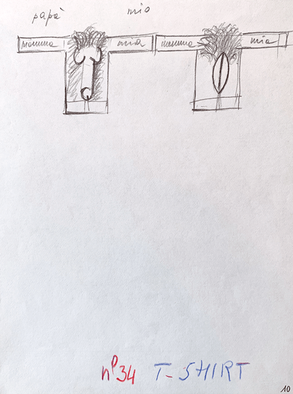 Dovendo fare progetto di T-shirt di solito si fanno disegni pubblicitari di prodotti, oggetti, sentimenti, ritratti, catastrofi, paesaggi, vacanze, bip…. Qui tentiamo come esperimento una t-shirt statistica di salvataggio umano. Progettare i buchi della maglietta fatti con tecnica sperimentata da soldati in guerra nelle trincee – Indossata, saranno operativi quelli già prodotti – Molti meno morti, statisticamente quasi nulli – Un progetto di salute corporale – Cosa ci tocca fare – Nel video Arcangelo fa combattere l’arcangelo Gabriele –