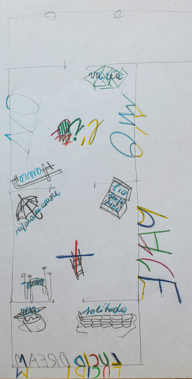 La fragilità, innanzitutto, e poi quanti pezzi compongono il pezzo, quanti materiali, quanti fili e connessioni. A parte i neon, in questo caso, il piacere è di maneggiare parole, tutte parole come la canzone di Mina. E le parole non stanno mai ferme – vanno a sbattere, fanno rumore.